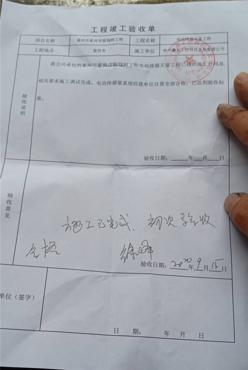 9月15日,現場進行了初步驗收,所有電動排煙天窗及配套設備運行正常,達到驗收標準!項目負責人簽寫工程驗收單。