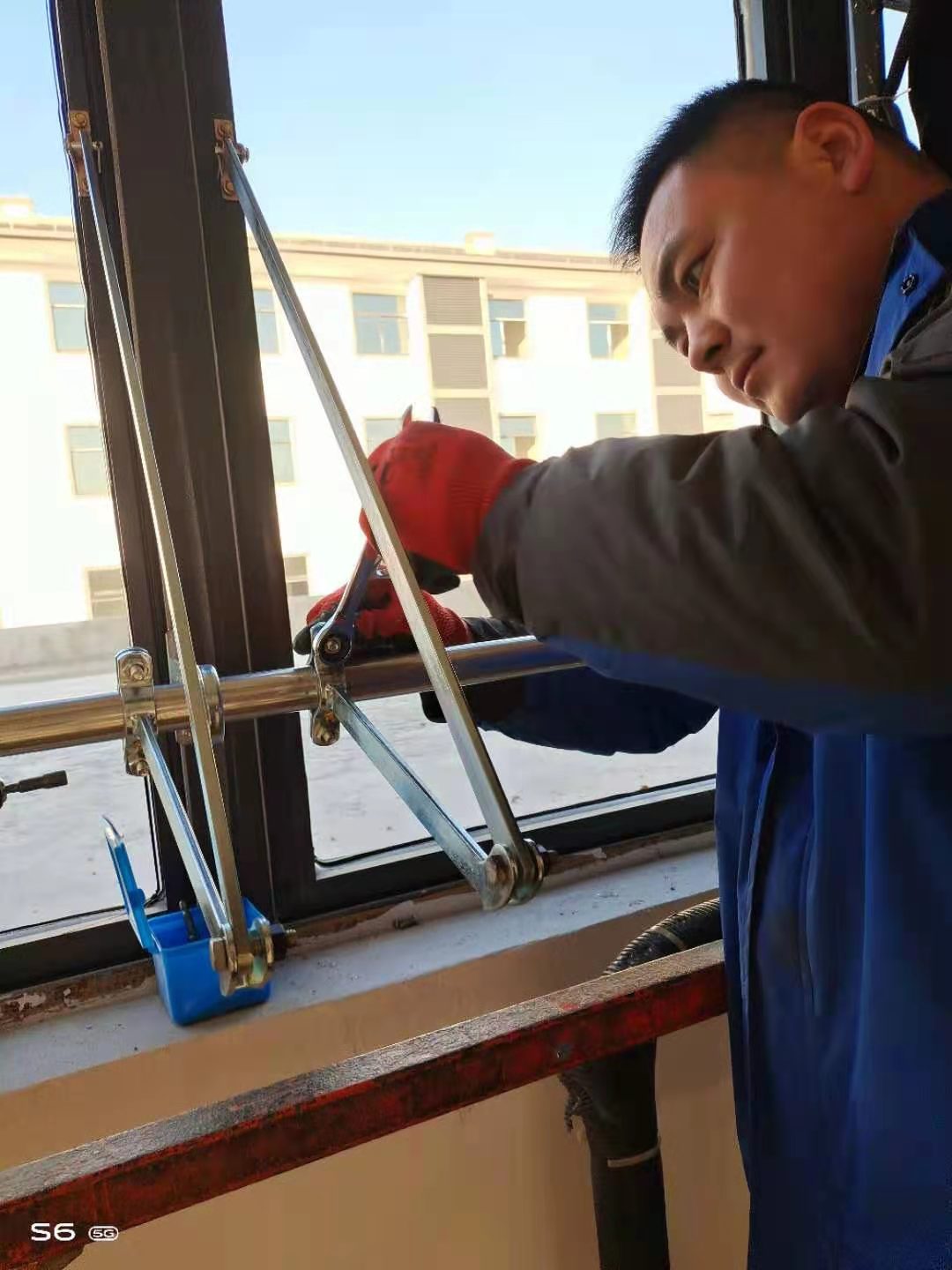 此次電動排煙窗工程采用曲臂聯(lián)動電動開窗器,由螺桿式電動開窗器驅動。