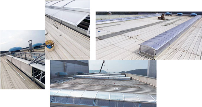 2. 圓拱型電動采光排煙天窗主要材料通常采光不同規格的鋁型材,采光材料一般使用PC陽光板或FRP采光板,天窗頂部為拱型,其好處是可以折射陽光擴大室內采光面積,且拱型的窗面利于夏季排雨,冬季又不易積雪,本身的自潔性較好,表面浮塵雨水沖刷,經常保持較好的采光效果。