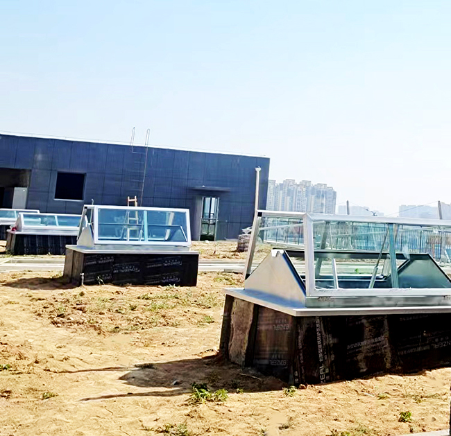 天窗外觀為三角形,天窗頂部可采用采光板或玻璃,有效增加室內采光,且防水性好。開啟電機設計成24V安全電壓,可連接消防聯動控制系統及風、雨、煙感應器。***開啟角度為60°。