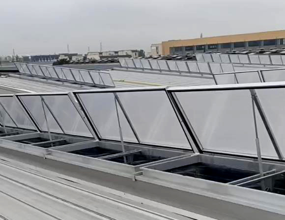 上圖為一字型電動采光排煙天窗,一字型的外觀,兼具采光于通風,并可有效減少風壓阻力,天窗頂部采用采光板,窗體與屋面成平行面,此窗型為連體式窗型,由若干個單體式窗型組合而成。
