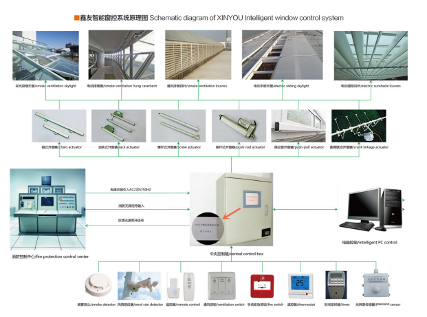 智能通風(fēng)控制系統(tǒng)由智能控制箱、墻裝開關(guān)、遙控器、風(fēng)雨感應(yīng)器、開窗器等組成,用戶可根據(jù)日常室內(nèi)環(huán)境的變化,通過遙控器或者開關(guān)來對窗戶進(jìn)行開啟和關(guān)閉的控制。